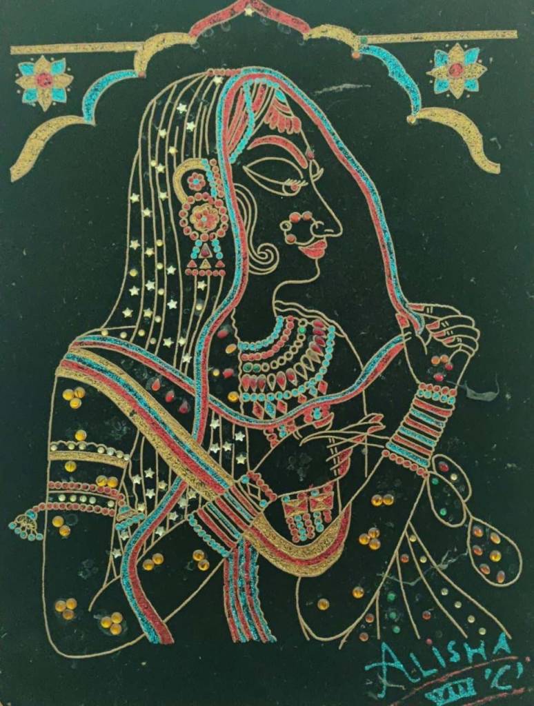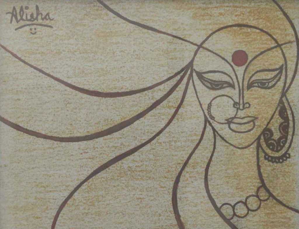 A goddess etched beneath the sky.Adorned with grace, with bindi bright,